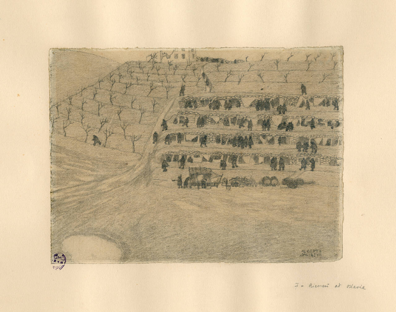 - NOTIZIE STORICO CRITICHE Si segnala la presenza al verso di un cartiglio in basso a destra con numero 38.\nTavola 7 di una serie eseguita sul fronte dall'artista. Il foglio era in origine conservato nella Cartella 35 del Archivio di Storia Contemporanea già Archivio della Guerra