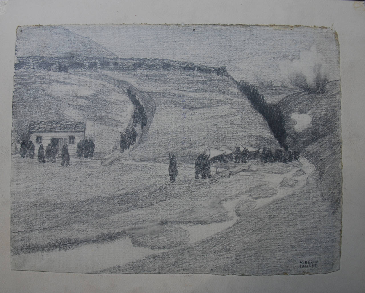 - NOTIZIE STORICO CRITICHE Tavola 18 di una serie eseguita sul fronte dall'artista. Il foglio era in origine conservato nella Cartella 35 del Archivio di Storia Contemporanea già Archivio della Guerra.\nIl titolo si trova sul foglio di supporto ed è coperto dal cartoncino dell'albo.