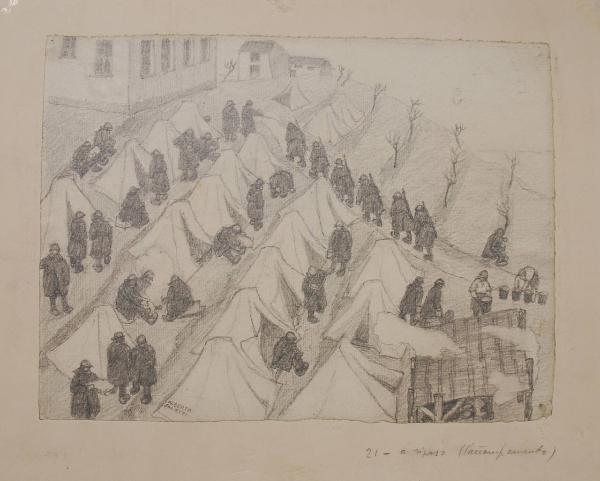- NOTIZIE STORICO CRITICHE Tavola 21 di una serie eseguita sul fronte dall'artista. Il foglio era in origine conservato nella Cartella 35 del Archivio di Storia Contemporanea già Archivio della Guerra.