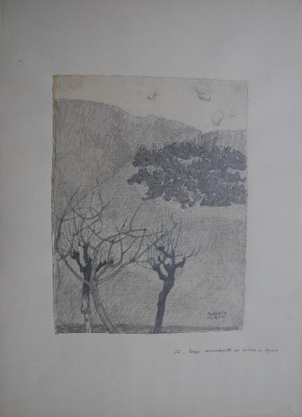 - NOTIZIE STORICO CRITICHE Tavola 17 di una serie eseguita sul fronte dall'artista. Il foglio era in origine conservato nella Cartella 35 del Archivio di Storia Contemporanea già Archivio della Guerra.\nLo Shrapnel è una bomba che esplodeva a tempo, veniva usata in presenza di ammassamento di truppe; proiettile di artiglieria azionato mediante spoletta graduata a tempo che esplode in aria, gettando sull'obiettivo biglie di piombo.