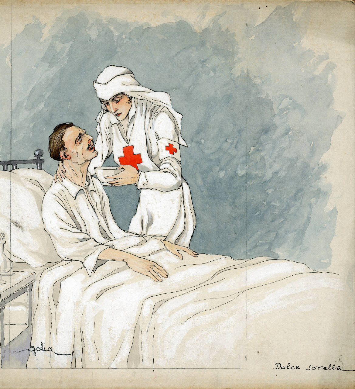 - NOTIZIE STORICO CRITICHE Il foglio presenta al verso un cartiglio di cui se ne conserva solo un frammento.\nProbabile disegno preparatorio per cartolina, si notino infatti i segni a matita all'interno della parte figurata, come ad indicare il taglio con la parte interessata per la resa finale.