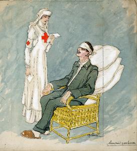 - NOTIZIE STORICO CRITICHE Il foglio presenta al recto in basso a sinistra un'iscrizione a matita non chiaramente leggibile ed al verso un cartiglio di cui se ne conserva solo un frammento.\nProbabile disegno preparatorio per cartolina, si notino infatti i segni a matita all'interno della parte figurata, come ad indicare il taglio con la parte interessata per la resa finale.