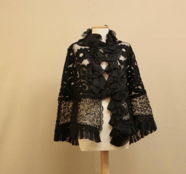 Mantellina lunga ai fianchi, con piccolo collo a listino e apertura anteriore con ganci. In tulle nero, decorato nela parte alta da applicazioni floreali e arabeschi in panno nero; da sotto il gomito all'orlo decorazione labirintica con aplicazione di fettuccia in cotone. Collo, apertura e orlo profilati da perline e nastro in taffetas pieghettato. Bordi rifiniti internamente da taffetas nero