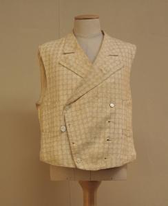 Gilè tagliato all'altezza della vita, doppiopetto, con otto occhielli e quattro bottoni in madreperla, collo con risvolti a punte dritte e quattro tasche con patta cucita, poste a coppie sul lato destro e sinistro. E' confezionato con tela (3 colpi di trama e tre orditi) fondo avorio, con sottili riche e bande nocciola che formano quadri incornicianti due pois rossi. Dorso in raso di cotone ècru, in due pezzi con cucitura centrale, due gheroni posti sull'orlo, al centro di ogni sezione, e cinturino con fibbia metallica. Fodera in raso di cotone. All'interno è cucta una tasca applicata.