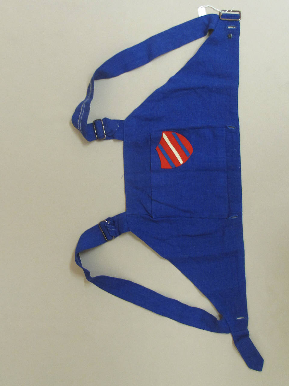 completo definito da un paio di pantalonci e un corpino. Pantaloncini molto corti, modellati da 2 coppie di pinces anteriormente e altre due coppie posteriormente, chiusi sul lato destro da una zip. Lungo la vita, rinforzata da una fettuccia in cotone color verde, sono cuciti quattro bottoni che servono a unire il corpino, completamente privo i maniche, a forma triangolare, con bretelle e chiuso sul dorso mediante una fibia metallica. Il coprpino presenta lungo il bordo quattro occhielli. Ateriormente è posta una tasca applicata su cui è ricamato ad applicazione uno scudo .... realizzato in feltro rosso con le bande bianche e azzurre.