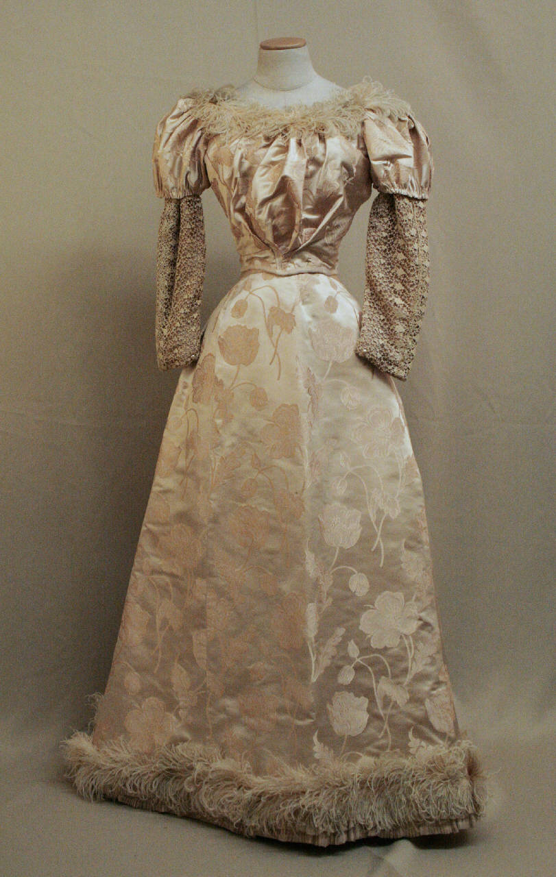 Abito in due pezzi confezionato con raso liserè operato, effetto damasco, in cui grandi motivi floreali sono realizati dalla slegatura delle trame. Busto con scollo a barca, modellabile grazie ad una culisse, sottolineato da piume tinte in rosa; busto congioco di pieghe aperte che nascono dal punto vita modellato a punta; dorso con vota modellata a punta, strutturato grazie a tagli e alla cucitura centrale che accoglie l'abbottonatura definita da dodici ganci; manica a prosciutto lunga arricciata, con l parte superiore gonifa in raso operato e la p arte aderente in raso rosa semplice doppiato in merletto écru; spacchetto al polso, chiuso da un bottone in madrepela e un'asola. Fodera in taffetas écru con sette stecche e nastro stringivita. Gonna lunga svasata, con cinturino, creata da cinque teli e gheroni, arricchita sul retro da un pieghe aperte, orlo bordato di piume; sottogonna in taffetas rosa con ampia balza in fondo in taffetas pieghttato e in chiffon rosa. Alalciatura definita da un gancio cucito alla cintura.