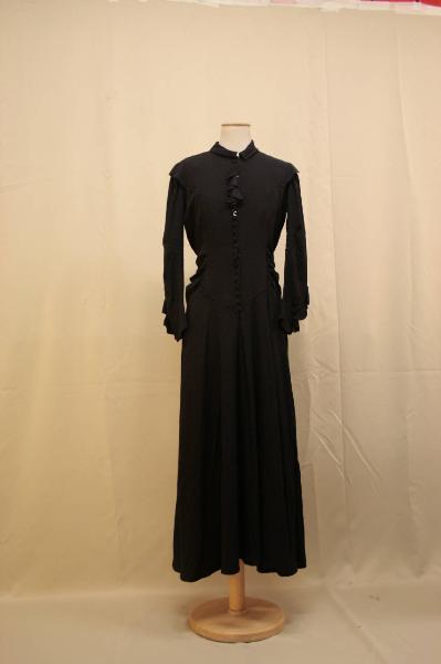 Completo definito da un abito e un gilet confezionato da cespo nero. Abito lungo, collo a cinturino ripiegato su se stesso, il busto è modellato da un taglio che crea un motivo a sparato, che si sovrappone alla pala, da cui parte, all'altezza della vita, una lieve arricciatura; abbottonatura nascosta parziale sul davanti, al centro, impreziosito da uno jabot, definita da quindici automatici e percorsa da ventitre bottoni non funzionali rivestiti in tessuto ; gonna svasata con piega centrale. Dorso con un pannello che imita l'effetto di uno sprone modellato, taglio in vita celato da una cintura cucita ai fianchi e gonna svasata. Manica in n pezzo, con pinces ll'altezza del gmito e una gala che sottolinea il polso. All'interno, all'altezza del petto, sono cucite gale arricciate in tafetas grigio, per modellare il petto; un pannello è cucito sul dorso, dalle spalle sino a metà schiena.\nGilet lungo ai fianchi, linea dritta, modellata da pieghe che partono dalle spalle, apertura sagomata che termina con un pannello triangolare. Dorso modellato da un taflio che parte dalle spalle e dalla cucitura centrale. Cuciture rifinie con fettucce nere.