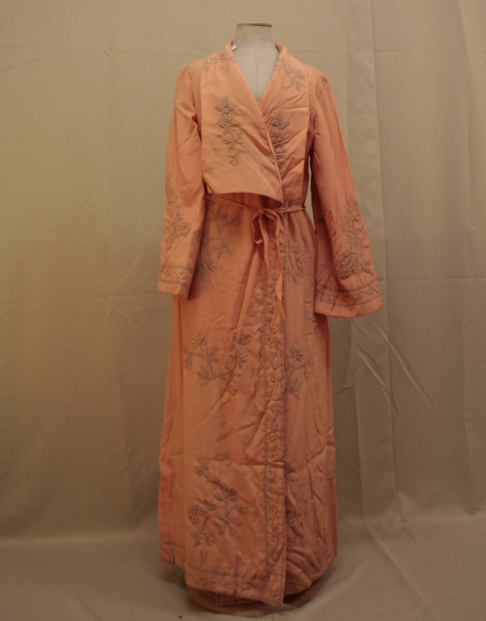 Veste lunga ai fianchi, confezionata in crespo albicocca decorato da rami fioriti ottenuti a ricamo, fermando con dei piccoli punti una imbottitura; fodera in taffetas in tono. Linea dritta, collo sciallato in crespo incrociato sul petto, modellata da pinces al seno; dorso in un pezzo; manica in un pezzo dritto. Orlo dela veste e delle maniche decorate da un motivo a spirali.. Allacciatura data dalla cintura in crespo, trattenuta da una coppia di passati ricamati sui fianchi e da una coppia di nastri nascosti cuciti sotto il collo e al fianco.