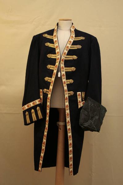 Livrea confezionata in panno blu scuro, rifinita con galloni in seta decorati con stemmi, la cui disposizione non segue la disposizio classica, ma sul dorso definiscono un motivo a rombi disposto nella zona della vita. Alto colletto a fascia che interessa solo il dorso, mostre molto sfuggenti dove sono applicati galloni dorati disposti imitando alari, segnati da altrettanti bottoni siglati da simboli araldici, l'allacciatura è data da un gancio; tasca con patta sagomata decorata da tre pseudo alamari impreziositi da altrettanto bottoni. Falde che si riuniscono posteriormente in piegoni fermati e spacco centrale, punto vita segnato da due bottoni. Maniche in due pezzi dritta, terminante con paramani su cui sono applicati tre alamari con bottoni. Fodera in diagonale di cotone nero e maniche in tela di cotone.