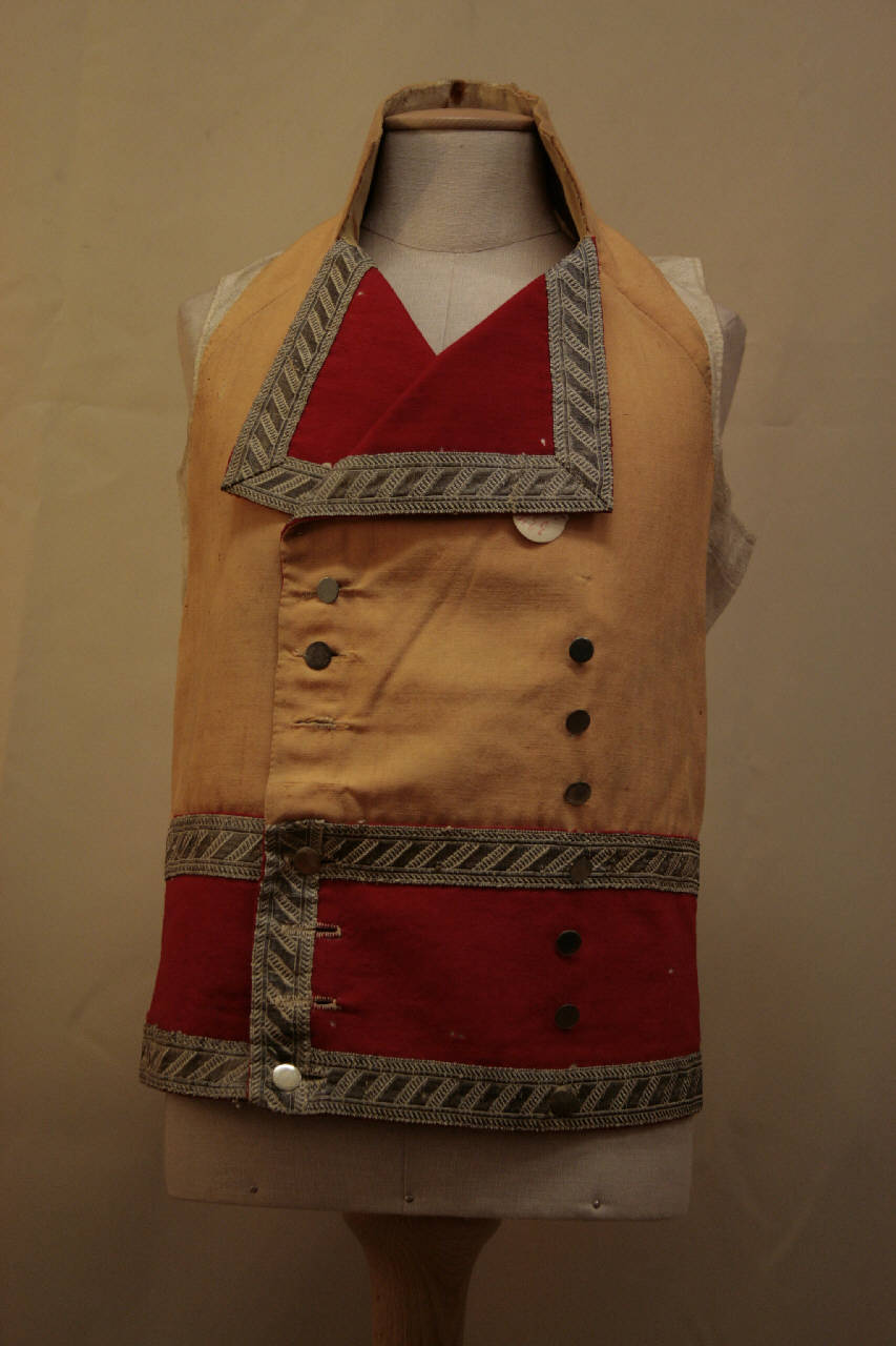 Gilè tagliato all'altezza della vita, a doppio petto, con sette occhielli e undici bottoni in metallo dorato, scollo impreziosito da un alto collo a cinturino e risvolti. E' confezionato con tla albicocca, mentre il risvolto e una fascia in corrispondenza della vita sono in tela di lana rossa. La fascia rossa e il risvolto sono sottolineati da un gallone in oro filato devcorato da losanghe. Il dorso è in tela di lino naturale, in due pezzi con cucitura centrale e adattabile da due coppie di cinturini in tela di lino. Fodera in tela di lino, mentre la fodera del collo è in taffetas giallo.