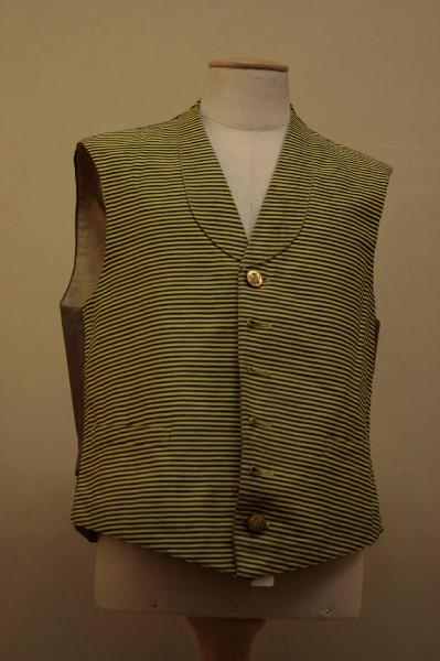 Gilet tagliato all'altezza della vita, ad un petto, con cinque occhielli e altrettanto bottoni in metallo dorato con stemma, collo con risvolti tondi, due tasche con patta cucita, poste sul lato destro e sinistro. E' confezionato in diagonale di lana a sottili bande verdi e gialle. Dorso in digonale di cotone marrone, in due pezzi con cucitura centrale, cinturino con fibbia metallica. Fodera in diagonale di cotone bianco. Stemma di casa Corti