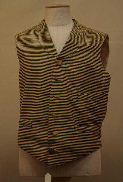 Gilet tagliato all'altezza della vita, ad un petto, con cinque occhielli e altrettanto bottoni in metallo dorato con stemma, collo con risvolti tondi, tre tasche con patta cucita, poste una sul lato destro e due sul sinistro. E' confezionato in diagonale di lana a sottili bande verdi e gialle. Dorso in digonale di cotone senape, in due pezzi con cucitura centrale, cinturino con fibbia metallica. Fodera in diagonale di cotone bianco. Stemma di casa Corti