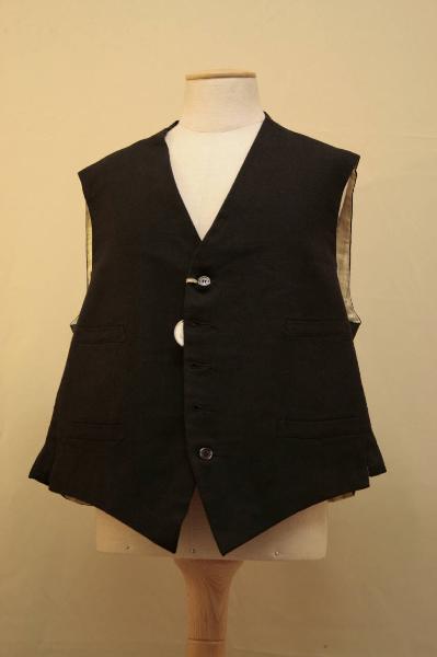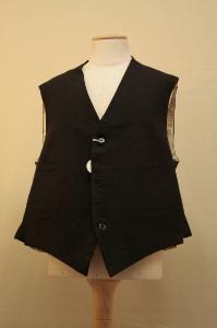 Gilè tagliato all'altezza della vita, ad un petto, con sei occhielli e altrettanto bottoni, quattro tasche con patta cucita, poste a coppie sul lato destro e sinistro. E' confezionato in panno nero. Dorso in diagonale diseta nero, in due pezzi con cucitura centrale e spacchetto terminale, cinturino con fibbia metallica. Fodera in diagonale di cotone bianco stampato a righe. All'interno, lungo lo scollo sono cuciti sei bottoni in madreperla