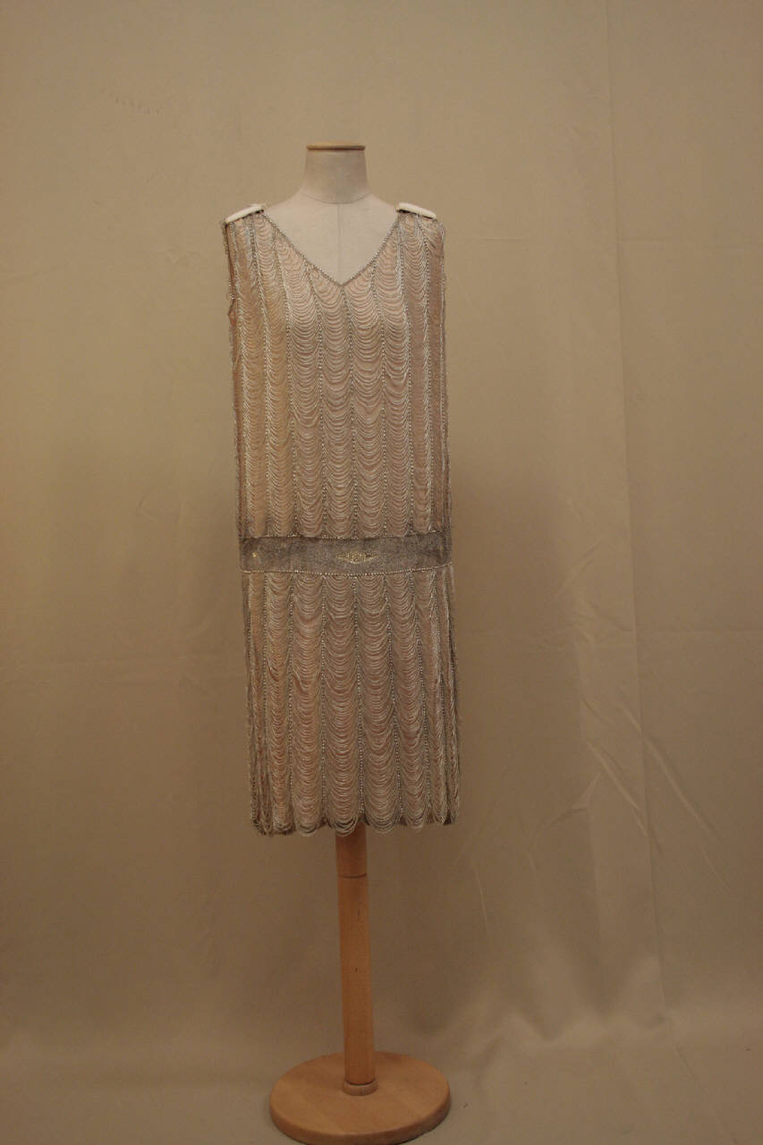 Abito a vita bassa, confezionato in crespo rosa, con scollo a v, senza maniche, linea della vita bassa sottolineata da una fascia realizzata a ricamo con perline di vetro che imita una cintura con motivi romboidali di strass, gonna liscia, con orlo smerlato ricamato con perline. Il tessuto è interamente ricoperto da perline opache e di vetro unite in file non tese e lasciate libere sullo sfondo
