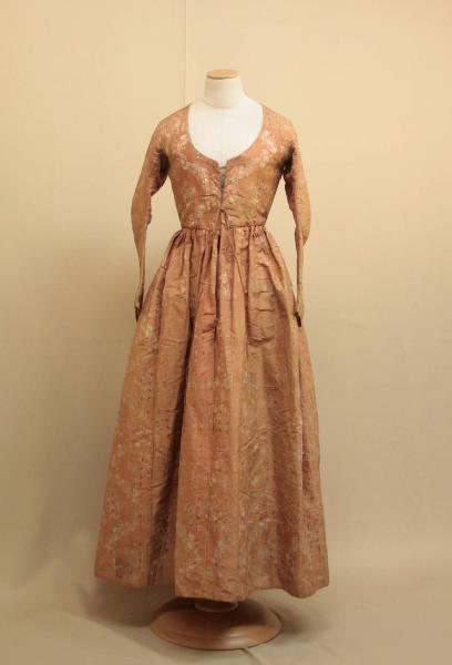 Abito confezionato in taffetas fondo salmone, decorato da sinuosi meandri definiti da nastri che trattengono mazzi fioriti; il disegno è dato da ordito verdi, rosa, rossa, bianchi e verdi. Ampio scollo rotondo, cucitura della spalla verso il dietro, taglio in vita; dorso strtturato da fianchetti e dalla cucitura centrale; gonna lunga sino aterra, confezionata in sei teli, cuciti lungo le cimose e arricciati in vita. Maniche in due pezzi lunghe e sagomate. Apertura parziale anteriorore, al centro, mediante cinqe coppie di asole che interessano solo il busto. Busto doppiato in tela di lino beige, mentre per i fianchetti in tela più chiara. La fodere delle maniche è formata anche da dicerse toppe in due tipologia di tela di lino stampata (fondo bianco decoro a piccoli fiori rossi; fondo biancp motivi stilizzati rossi e neri) o tele qadrettate.