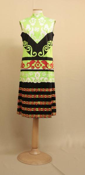 Abito al ginocchio realizzato in jersey stampato nelle onalità del verde, rosso, bianco e nero a cornici con elemeti stilizzati. Privo di maniche, con alto collo che sul dietro si annoda; pinces al seno, con busto aderentee gonna svasata. Dorso con aglio al centro ove è inserita la cerniera.