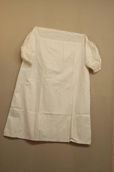 Camicia da notte in tela di lino bianca, lunga, con collo a cinturino, con sparato definito da una piega piatta rifinita da un bordo smerlato ricamato; abbottonatura parziale, sotto alla quale nasce una piega. Dorso con sprone drito e due pieghe. Gheroni ai fianchi. Manica lunga lusantem con polso rifibito da un bordo festonato ricamato.Chiusura effettuata da due bottoni rivestiti in tessuto, uno sul colletto e uno sul petto, con altrettanti occhielli.