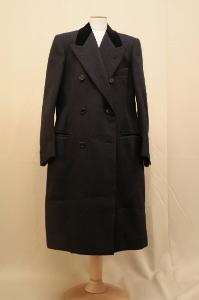 Soprabito a doppio petto, in lana garzata grigia, con colletto in astrakan nero e ampi risvolti a lancia con occhielli, abbottonatura definita da sei occhielli e sei bottoni in corno. Due tasche con patta dritta a sinistra e a destra e un taschino con patta cucita all'altezza del petto, lato sinistro. Maniche in due pezzi. Dorso con cucitura centraleterminante con uno spacco. Fodera in raso nero, su cui è cucita l'etichetta.