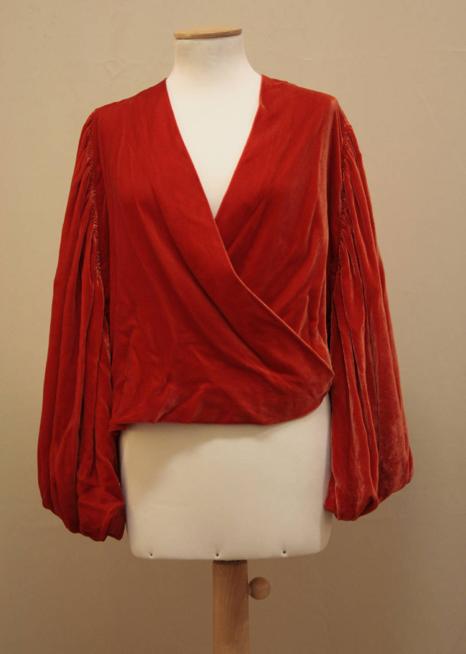 Bolero in veluto rosso-arancio con scollo a V, incrociato sul davanti e chiuso da automatici, caratterizzato dalle ampissime maniche arricciate con taglio raglan. Fodera in crespo si seta