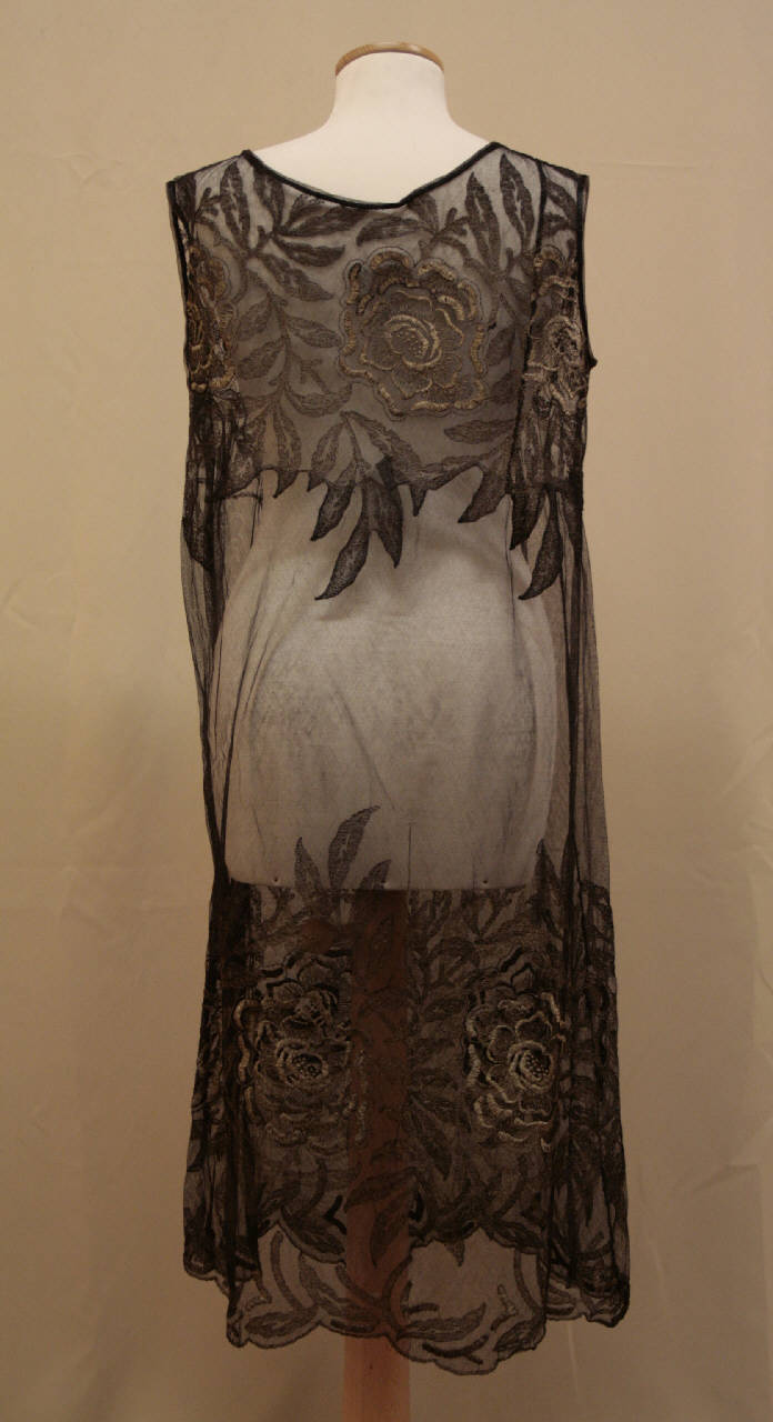 Abito dalla linea diritta, corto al ginocchio, con scollo rotondo e privo di maniche, con taglio irregolare sotto al seno e drappeggio sul davanti, all'altezza del fianco. E' confezionato in tulle di seta nero, ricamato in oro filato con grandi fiori e foglie, disposte sul corpino e lungo il bordo