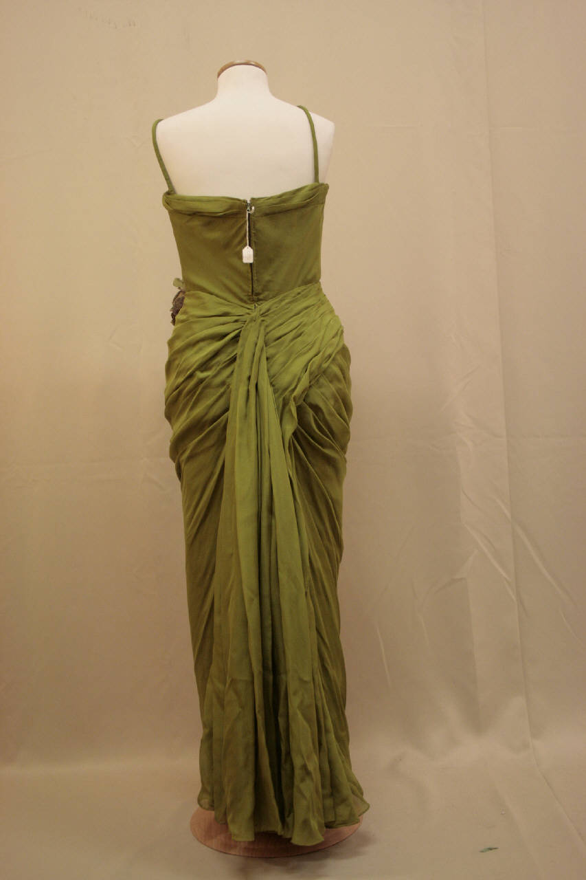 Abito in chiffon verde. Scollo a cuore sostenuto da due bretelle che partono dal centro e arrivano al dorso. Busto drappeggiato e strutturato da tagli. Gonna aderente, su cui si drappeggia un pannello che, partendo dal fianco sinistro, avvolge quello destro, per formare, sul centro del dorso, un motivo a coda, sovrapponendosi ad un altro pannelo che fascia il fianco destro. Dorso con busto liscio, con cucitura centrale che accoglie la cerniera, all'orlo la gonna ha uno spacco, trattenuto da sei elastici. Per poter utilizzare la cerniera che arriva fino ai fianchi, la coda è mobile e si aggancia alla gonna mediante sei ganci e altrettanto asole in seta. Doppiato in taffetas verde, la zona del busto è foderata in chiffon sintetico; è irrigidito da otto stecche ed è presente il nastro stringivita. Sulla fodera è applicata l'etichetta.