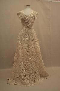 Abito in tre pezzi, realizzato con mrletto in seta, sia ad ago che a tombolo, creando motivi floreali stilizzati. Bordo semicircolare con orlo ripartito in sei festoni. Cintura in raso avorio, sagomata, mossa da pieghe piatte e irigidita da cinque stecche; chiusura data da ganci; l'allacciatura è nascosta da due fiocchi. Gonna svasata, lunga sino ai piedi, con lungo strascico, con apertura sul dietro, al centro, all'altezza della vita, dove è stato applicata una fettuccia.