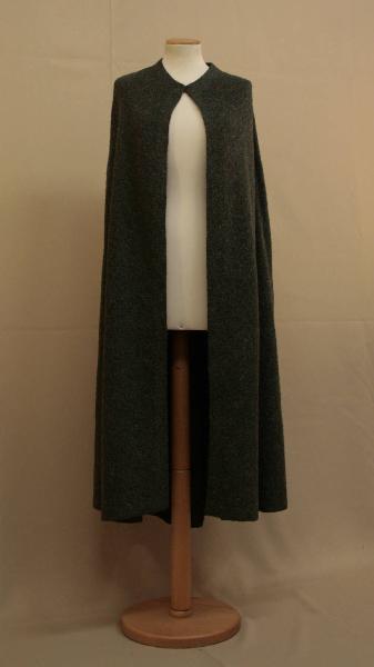 Mantello svasato, scollo a girocollo, chiusura con un cancio metallico, con cucitura sulle spalle che prosegue sui fianchi e sul centro del dorso. Lunga sino ai piedi.