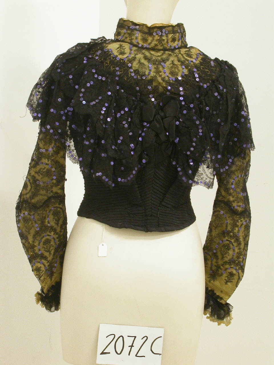 alto collo a fascia, con pettorina in pizzo nero, doppiato in taffetas giallo, ricco colletto doppio a ruches in pizzo nero ricamato con paillettes e impreziosito da un fiocco in raso nero; busto tgliato in vita, sagomto da pieghe in cannettato di seta nera. Dorso con abbottonatura nascosta completa centrale, data da diciassette ganci. Maniche sagomate in pizzo ricamato doppiato in taffetas giallo, polso con spacco chiuso da un bottonericoperto in filo e un'asola in seta e polsino in pizzo, impreziosito da una gala in organza avorio. Fodera in diagonale dic otone bianco, strutturato con tagli e pinces, su c sono state cucite tredici stecche ricoperte in fettuccia e il nastro stingivita con il nome della sartoria. Per la zona del pettoè stata utilizzata della tela gialla; per le maniche tela di lana stampata a quuadri.