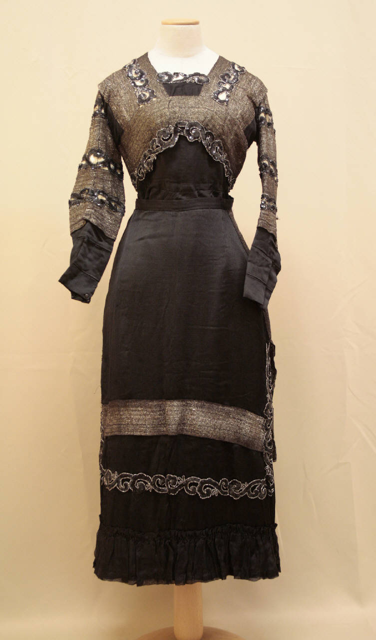Corpino con scollo quadrato definito da bande di lame disposto verticalmente per le spalle e orizzontalmete per lo scollo, con pettorina in crespo nero di seta; su queste bande sono state applicate ricami a volute e girali in paillettes e perline nere, ricamati su tela di cotone rada e poi applicati su nastri in crepe bianco, busto aderente in crepe nero. Maniche sagomate che riporatno il medesimo decoro, con alto polsino in crepe nero. Sul dorso allacciatura nescosta da un pannello su cui è il ricamo in paillettes, chiuso da quattro automatici. Fodera in raso bianco, strutturata con pieghe e tagli, chiusura totale definita da undici ganci. Gonna lunga e svasata, in crespo nero, con cinturino e orlo sottolineato da gala arriciata in organza; sulla gonna è applicato ua seconda gonna più corta, decoraao, in bsso, da una strscia posta orizzontalmente di lame e, anteriormeneta, sull'orlo è applicato il ricamo di paillettes; la parte anteriore è più unga di quella posteriore. Abbottonatura parziale sul dorso, in corrispondenza della cucitura centrale, con cinque bottoni e tre ganci. Fodera in raso bianco, con orlo sottolineato da alta balza arricciata.