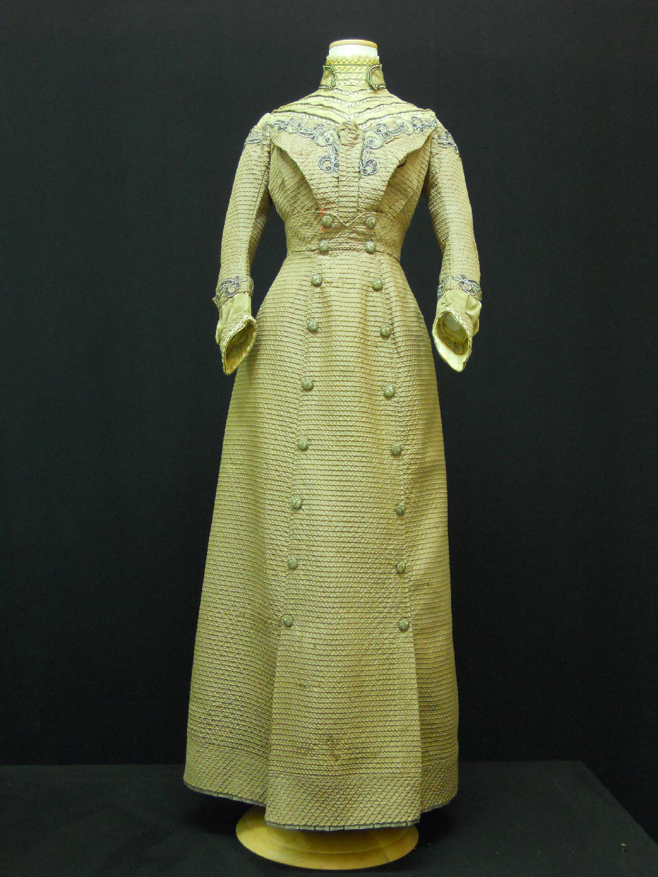 Abito in due pezzi confezionato in cannettato: dalla alternanza fra orditi si seta e di lana molto più spessa crea un effetto ci costine molto accentuate. Busto con collo ad ad anello confezionato in gros beige e galloncini in seta e oro filato, secondo un gusto che si ritrova anche nella guimpr, a cui si unisce il busto su cui si innetsa un pannello triangolare in cannettato che nasconde anche l'abbottonatura ottenuta da ganci metallici, e su cui è applicato un cordoncino in seta ricamato con oro filato e paillettes dorate; ricamo che contuinua anche sul dorso. Maniche in due pezzi lunghe e sagomate, con un polsofantasia . Gonna svasata lunga, con vita segnata da alto cinturino sagomato, e segnata da un pannello trapezoidale posto davanti, al centro, percorso da quattordici bottoni non funzionali (altri quattro sono applicati sulla cintura). Da questo telo partono gli altri due che si congiungono al pannello trapezoidale del retro, anch'esso percorso da botton non funzionale (sedici sul pannello e sei sulla cintura sagomata). Il telo posteriore anche la chiusura, ottenuta da automatici. La cintura è foderata in tela di lino nocciola, metre sul bordo corre un nastro di tela di cotone lilla su cui corre una gala in raso di seta verde pieghettato.