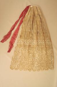 Grembiuledi forma rettangolare, confezionato con un telo di cotone prima ricamato a punto catenella con motivi floreali e, lungo l'orlo smerlato, con un motivo a nastro, e successivvamente stampato con motivi floreali stilizzati in arancio, nella parte inferiore, quindi una fascia con elementi circolari e, infine, elementi vegetali fra motivi a rami di corallo. All'alezza della vita, è pesente una fitta arricciatura, trattenuta da una fettuccia in coton, alle cui estremità è cucito un nastro in taffetas di seta rossa, decoato da fiori realizzati con trame broccate crema e verdi, a cui è cucita il grembiule con una fitta arricciatura.