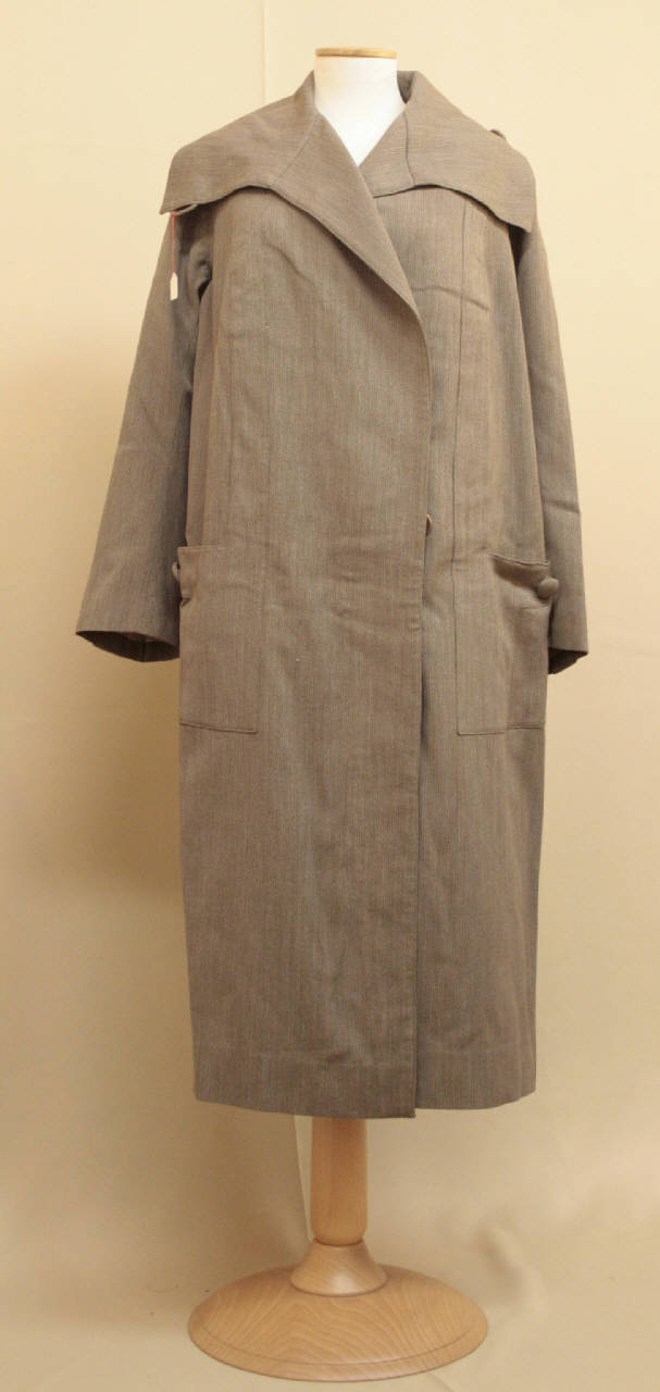 Soprabito confezionato in piquet di colone nelle tonalità del verde e del grigio. Ampio collo sciallato che può essere sollevato e chiuso mediante un bottone rivestito in tessuto e una grande asola reaizzata sempre in tessuto, chiusura nascosta a doppio petto mediante tre acchielli e tre botton in corno; coppia di tasche applicate rettangolari che proseguono anche sul dorso e decorata da un bottone non funzionale rivestito in stoffa, dalle tasche inoltre diparte un pannello che corre verso le spalle. Dorso in un pezzo. Maniche dritte, con il polso sottolineat da un alamaro in stoffa, su cui è applicato un bottone non funzionale rivestito in tessto. Fodera in tela di cotone beige parziale, che interessa le maniche e il busto. Sulla fodera è cucita l'etichetta.