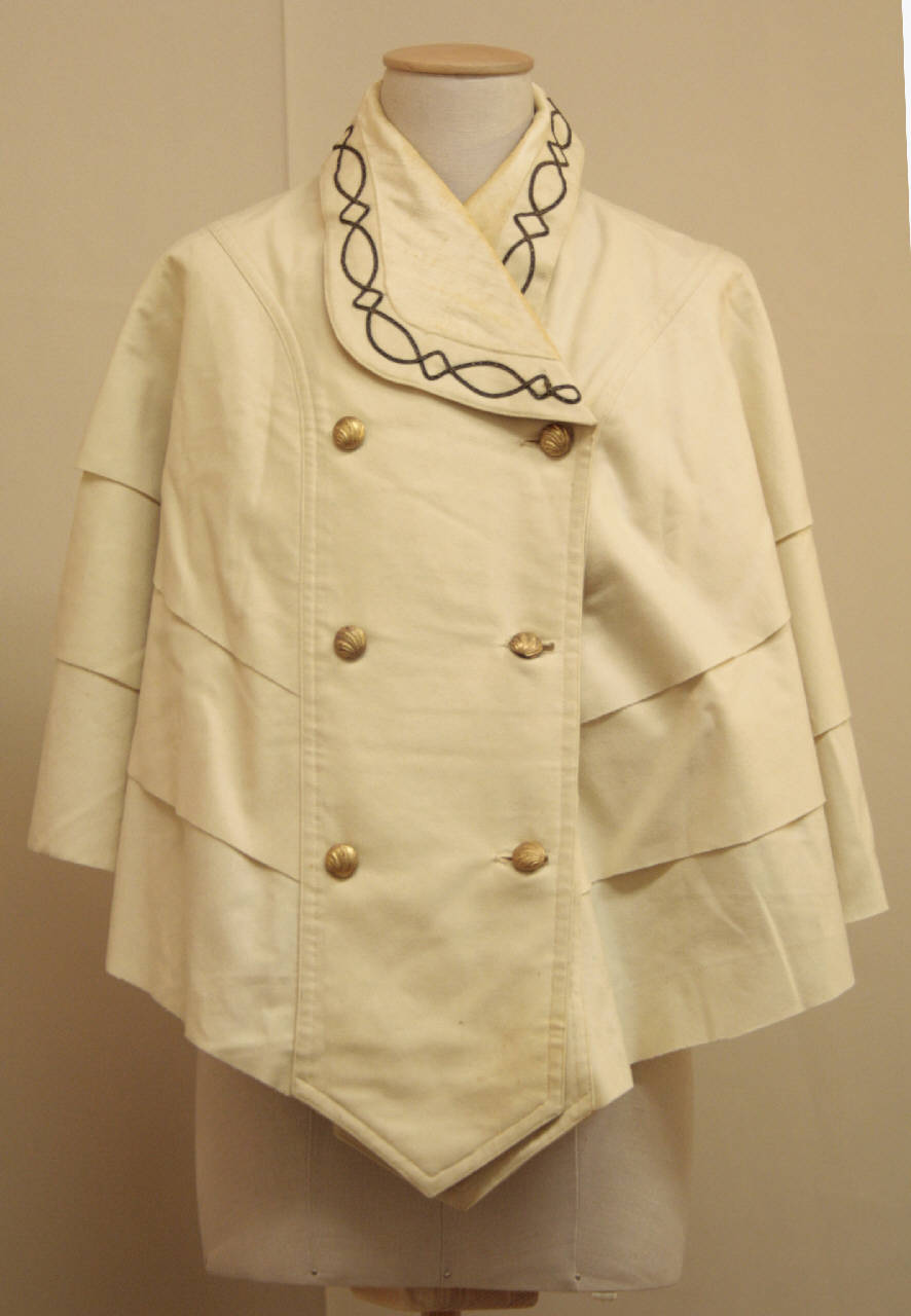 mantella confezionata in panno color panna, a sezione quasi circolare, con collo con ampio risvolto in velluto avorio, abbottonattura doppio petto ottennuto da sei bottoni in metallo e tre occhielli. Il manto è strutturato in tre balze dall'altezza degradante. Il bordo del collo è impreziosito da un ricamo ottenuto con un cordoncino nero disposto a formare un disegno geometrico.