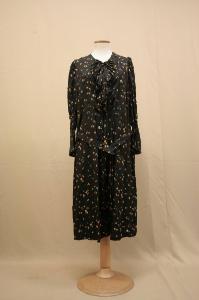 Abito di linea drita sotto il ginocchio, in taffeta operato stampato: la slegatura degli orditi crea motivi ad onde, dove si stagliano fiorellini stampati in verde, rosso, viola ed ècru. Scollo a V arrcchito d una gala; l'abito è modellao da tagli, pinces e pieghe iatte poste al centro e che aprtono dal punto vita, dorso con scollo a girocollo, pinces e tagli. AMniche arriciate lunghe, co alto polso stretto da due autmatici. Cintura rettangolare, con fodera in gros nero.