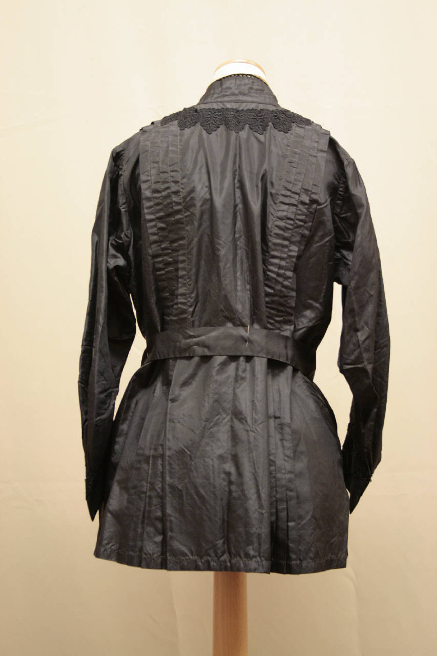 Camicia in taffetas nero, colletto a cinturino sagomato, doppiato in taffetas bianco e rifinito con un merletto nero, gala in pizzo con fiocco in taffetas gruppo di pighe piatte partono dalle spalle, abbottonatura centrale nascosta, ottenuta da sette automatici, su cui corrono ventidue bottoncini rivestiti in tessuto; corre parallelamente alla bottonatura , un ato merletto smerlato nero decorato da elementi vgetale, che segue la forma dello scoolo sia anteriormente che posteriormente. Dorso arricchito da pieghe piatte che si originano dalle spalle. Manica in un pezo blusante, con peghe al gomito e polsino rifinito con il merletto.