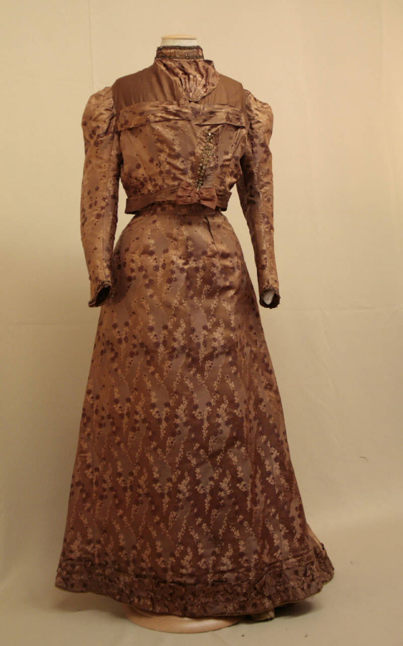 Abito in due pezzi confezionato in raso liserè operato: sul fondo nocciola si stagliano rametti fioriti viola e bianche realizzati dalla slegatura delle trame.\nBusto con collo ad anello (foderato in taffetas verde) chiuso posteriormente e impreziosito da un gallone, guimpe in raso che nterrompe lo sprone in taffetas marrone, sottolineato da un motivo a pieghe; corpino con allacciatura assimetrica sottoineati da bottoni non funzionali in strass, posti anche sulla spalla. Vita sottolinata da alta cintura pieghettata che prosegue anche sul dorso, modellato datagli e pinces.Mniche lunghe sagomate e arriccitae. Il corpio è foderato in diagonale di cotone color salvia, strutturato da tagli e pinces, chiuso al centro, anteriormente, da ganci e su cui sono state applicate dodici stecche rivestite in fettuccia e il nastro stringivita. Gonna svasata, lunga sino a terra, realizzata in più teli, con cintura in vita, da cui partono anteriormente pinces e posteriormente pieghe che la modellano; cucitura centrale che avccogli i ganci per l'abbottonatura. Strascico creato da gheroni. Lungo l'orlo corre un voulant. La cintura e la ona dell'orlo sono rafforzati con pannelli di diagonale di cotone salvia; sul quale, nell'orlo, è cucito una gala smerlata nel medesimo tessuto.