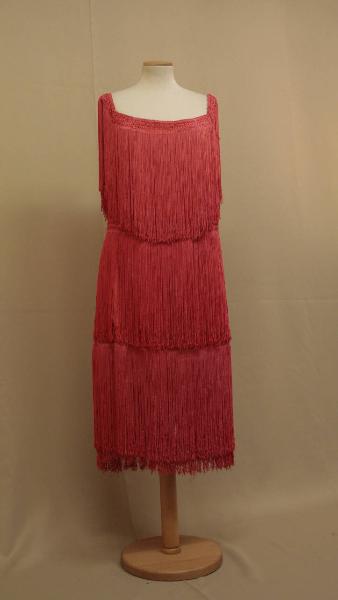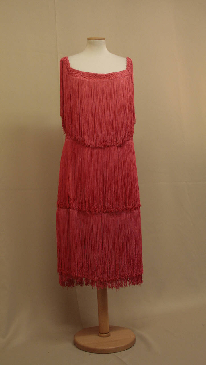 Abito al ginocchio, con scollatura rettangolare, confezionato in tela di cotone aragosta, su cui sono applicati tre ranghi di frange in filato sintetico. Doppiato in taffetas bianco; sulle spalline sono cucote i ganci che servono a lergare le spalline del reggiseno.