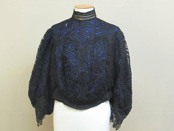 Blusa confezionata con un merletto in cotone nero che riprende il pizzo rinascimento, doppiato in raso blu. Collo ad anello sostenuto da stecche, blusa arricciata anteriormente, con vira segnta da una cintura che prosegue sul dorso, dove, al centro, è l'abbottonatiura, chiusa da ganci. Manica riccia eblusante, con alto polso. All'interno, all'altezza della vita, è stato cucito il nastro strinigivita.