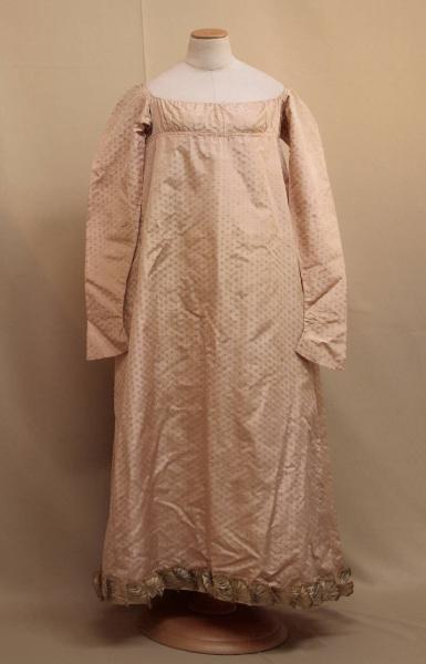 Abito a vita alta in taffetas liserè: sul fondo creato dalla trama rosa e ordito bianco si stagliano piccoli motivi a rombi definiti dalka slegatura della trama. Ampia scollatua con coulisse, vita sotto il seno segnata da una cintura da cui parte la lunga gonna; arricciata posteriormente mediante quattro piccole coulisse in cui passano cordoni in seta. Cucitura centrale parzialmenete aperta sul busto. Il bordo della veste è percorso da un nastro in raso ècu pieghettato e rifinito con tulle di seta. Maniche dritte in un pezzo lunghe a coprire parzialmente la mano. Il