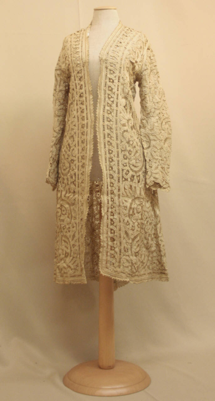 Canottiera confezionata da nastri in tela di lino uniti fra loro da ricami in lino atti a formare un pizzo rinascimento, creando motivi vegetali stilizzati. Apertura completa sul davanti, con lunghe falde che arrivano al ginocchio; dorso con falde morbide e con orlo stondato al centro. Maniche dritte sagomate.