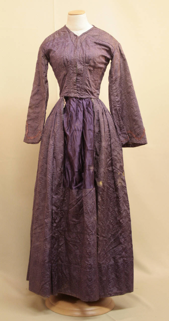 Veste a crinolinaconfezonata in damasco viol liseè deoctao con motivi asratti e geometrici. Corpino con scollo a girocollo, piccolo sprone diritto, il buto è modellato da pieghe che partono dal taglio presente al punto vita, dorso stutturato con sprone convesso e tagli. Allacciatura frntale e centrale, formata da otto ganci. Manica in un pezzo svasata, con il polso sottolineato da una ruche in taffetas rosa. Busto foderato in tela di cotone binco, con una stecca. All'altezza della vita è stata cucita una gala arricciata in tela di cotone stampata. Gonna ad otto teli arriccita in vita.