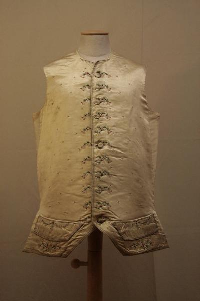 Gilet confezionato in raso avorio ricamato in seta policroma, formando decori vegetali stilizzati. Scollo a girocollo, mostre dritte dove sono undici bottoni rivestiti in tessuto e ricamati e altrettanti occhielli, in corrispondenza dei bottoni sono stati ricamati dei finti occhielli, tasca con patta, falde sfuggenti verso il dorso. Dorso con sprone in tela di lino, come i fianchetti, e in tela di lana gialla, con cucitura centrale che crea uno spacco. Fodera in tela di cotone cardato.