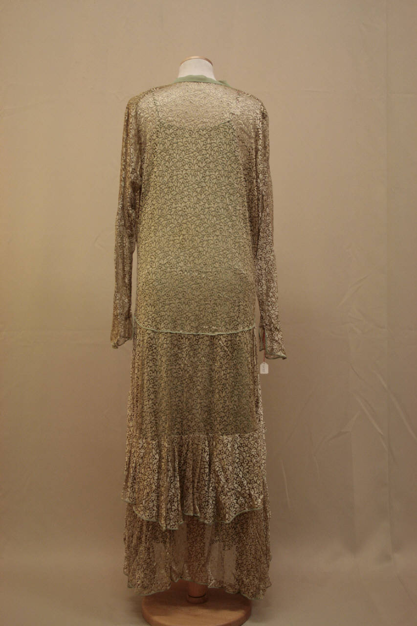 Abito a vita bassa confezionato in pizzo in seta nocciola, scollo a V molto profondo anteriormente e a girocollo posteriormente, profilato di un nastro in chiffon verde salvia, taglio in vita all'altezza dei fianchi sagomata, a cui è unita la gonna svasata e una coppia di balze con orlo degradante.rifinito in organza. Manica dritta, con spacco al polso chiuso da un bottoncino rivestito in tessuto e polso svasato. Sottoveste in crespo verde con scollo a sottabito retto da sottile spalline, piccole pieghe all'atezza del seno, taglio in vita all'altezza dei fianchi a cui è unita la gonna svasata con orlo degradante.
