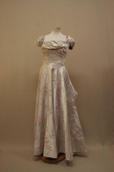 Confezionato in lampasso lanciato: sul fondo in ras si stagliano rose rosa con fohlie verdi, ottenute dall'intervente della trama di fondo e di una tr ama supplementare. Scollo rettangolare, sottolineato da una bordo drappeggiato che forma anche le spalline che fasciano le spalle, taglio in vita da cui partono pinces; abbottonatura incrociata sul dorso, con andamento triangolare e mossa da drappeggi che si originano da pieghe; chiusura effettuata da ganci. Dal taglio in vita parte la gonna svasata, con gherone, e con drappeggio laterale. All'interno, sul busto sono cucite quattro stecche e il nasteo stingivita.