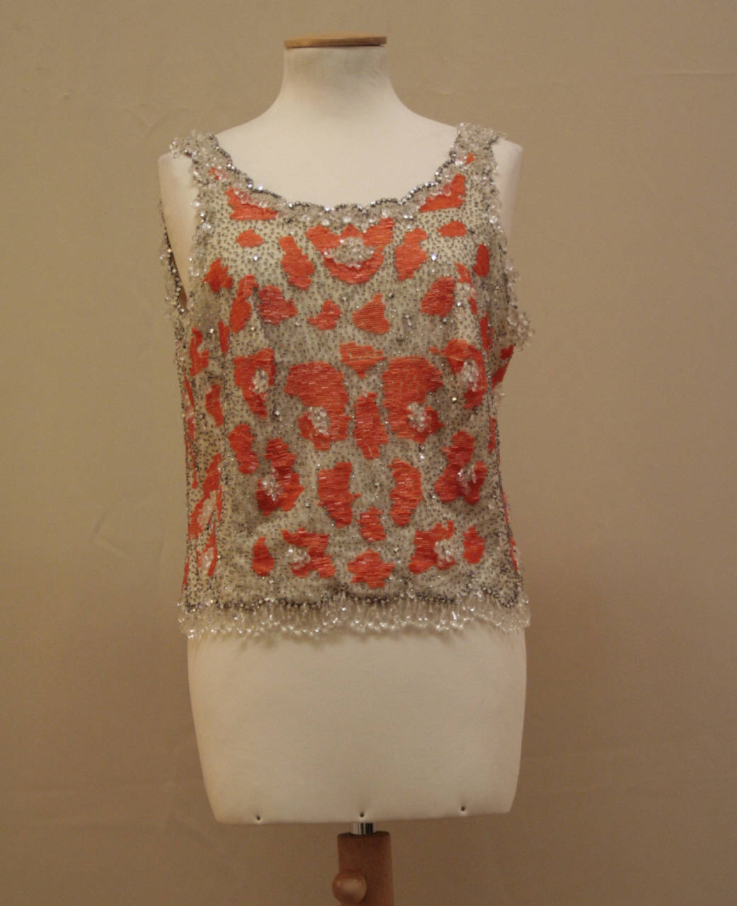 canottiera in tulle bianco ricanato con cannette aragosta, perline e d elementi in plastica che imitano pietre sfaccettate, strass che diegna un motivo maculato. Scollo rotondo, molto profondo sul dorso, con orli festonati e rivinit con strass; tagliato oltre la vita e rifinita con briglie in cannette traspareni e perline opache. Strutturata da pinces all'altezza del seno, cucitura cntrale sul dorso che accolie la ceriera. Fodera in tafftas bianco dove son cucite le etichette