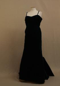 confezionato in velluto color pavone, scollo a cuoer sostenuto da sottili bretelle, con drappeggio all'atezza del seno e modellato dal taglio centrale e da pinces a livello del busto; il dorso è strutturato da tagli verticali che donano ampiezza al fondo, creando anche lo strascico. Abbottonatura effettuata da una cerniera inserita nella cucitura centrale del dorso e da due ganci. Fodera in taffettas pavone, il busto è doppiato in organza, taffetas e tulle nero. Sulla fodera è cucito il nastro stringivita e ucita l'etichetta. Sciale in chiffon in tono.