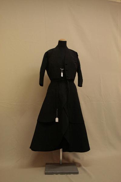 Confezonato in gros nero, Bolero con scollo a V montante, abbottonatura al centro davanti, con tre bottoni rivestiti in tessuto e altettanti occhielli, modellato da pinces, maniche a chimono con tassello; dorso in un pezzo modellato da pinces. Fettuccita in taffetas per rifinire l'orlo. Abito con scollo a cuore, con bretelle allacciate dietro le nuca, busto modellato da pinces, con taglio in vita, dorso modellato dal taglio centrale, gonna svasata definita anteriormente da due ordini di balze degradanti, che imitano l'effetto di petali, dorso liscio. Cintura rettangolare staccata.