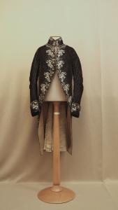 Marsina confezionata in velluto tagliato marrone, con trame lanciate verde e rosa che formano rispettivamente delle righe e dei motivi a scacchiera; il velluto è ricamato in seta policroma, paillettes , strass e ciniglia, creando un disegno floreale. Alto colletto a fascia, mostre molto sfuggenti dove sono dieci grandi bottoni rivestiti in tessuto e ricamate e un'asola., in corrispondenza del quarto bottone. Tasca con patta sagomata e decorata da tre bottoni. Falde squadrate e sfuggenti che si riuniscono posteriormente in piegoni, fermati da tre bottoni e spacco centrale, punto di vita ribassato. Fodera in raso di seta avoio e maniche foderate in diagonale di cotone.