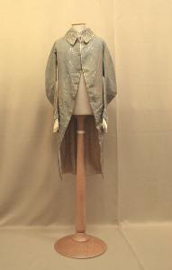 Marsina confezionata in taffetas azzurro operato, decorato da minuti motivi ottenuti dalla slegatura dell'ordito, ricamato in seta policroma, creando un disegno floreale. Collo su alta fascia, mostre molto sfuggenti dove sono cinque grandi bottoni non funzionali rivestiti in tessuto e ricamato. Tasca con patta sagomata decorata da tre bottoni. Falde sfuggenti che si riuniscono posteriormente in piegoni e spacco centrale, punto via ribassato sottolineato da due bottoni, maniche in due pezzi dritta, terminante con paramani e spacco al polso. Fodera in taffetas rosacea e tela di lino naturale.