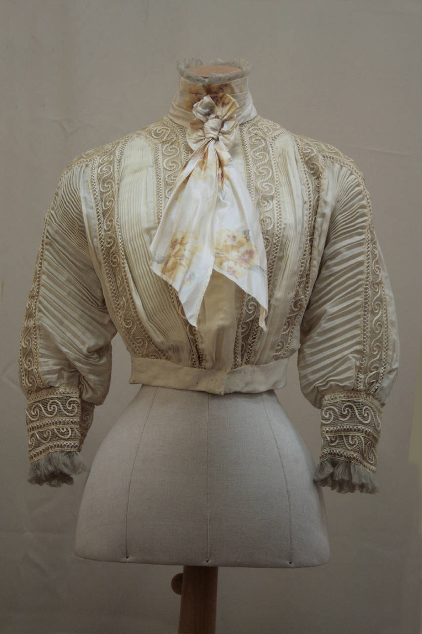 Camicetta con alto collo ad anello, chiuso da ganci ed unito al capo sempre mediante ganci, in taffetas pieghettato bianco stampato con effetto "chine à la branchè" che crea anche un fiocco che cela l'abbottonatura, formata da bottoni a pressione. Il colletto è rifinito con una rouches di organza bianca. La blusa è confezionata in tela di lana biana plissettata e decorata da falsature di garza ricmata con spighette di seta bianche con un motivo a spirale. Le falsature sono poste verticalmentee orizzontalmete, seguendo al linea delle spalle e le maniche a chimono, congiungendosi con il polsino, definito da due falsature e terminando con una rouches di organza bianca. Il dorso è oercorso da altre due falsature. In vita la blusa è stretta da una cintura. Il capo è interamnete foderato in tela di lino écru, modellato attraverso pinces e su di essa è applicata il nastro stringiviat che riporat il nome dela ditta. LA fodera è chiusa anteriormente, in modo indipendente, mediante ganci.